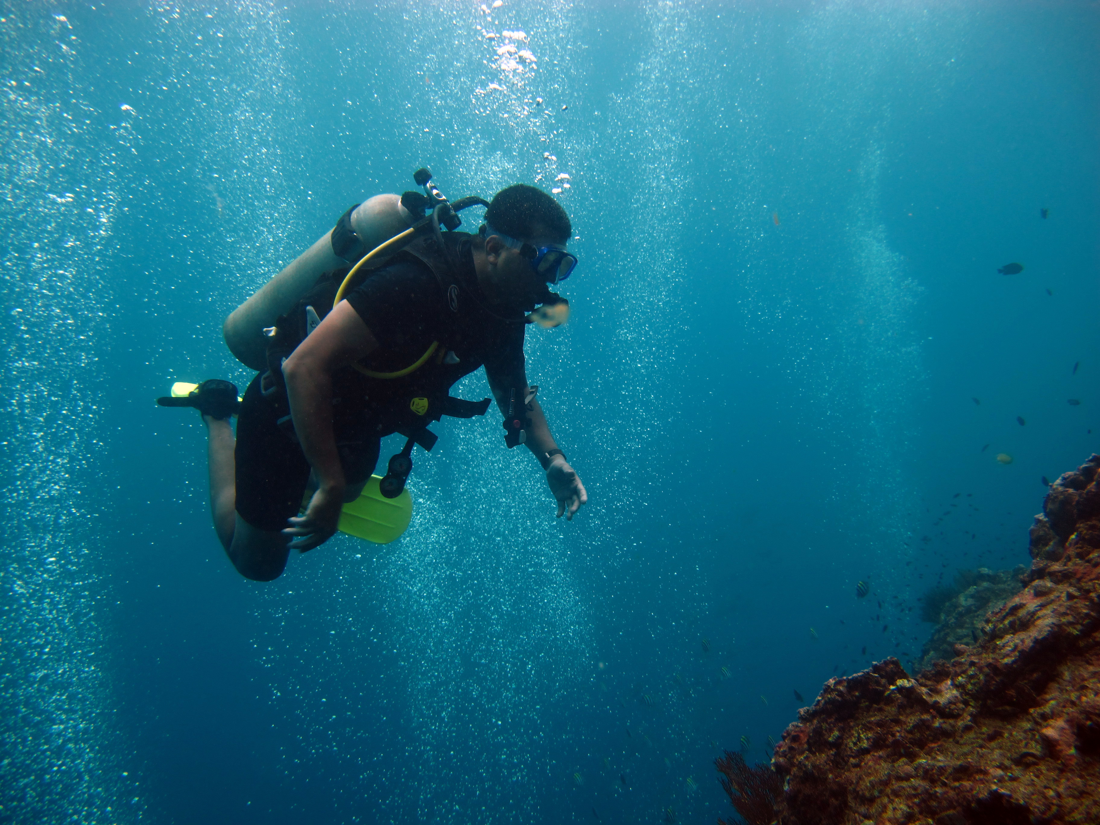 {There I was. On the edge of the boat. With a lifelong fear of deep water. Strapped to 20 litres of oxygen. Being egged on by my dive mater to jump in. After what seemed like an eternity, I did. Where the only sound was my own shallow scared breathing consuming that oxygen way too fast. And after a few minutes, when the initial terror subsided, I opened my eyes. And everything till then, leading to THAT ONE moment, …all that…they became worth it. I was in another world and I knew it then : I’ll forever remember this moment }